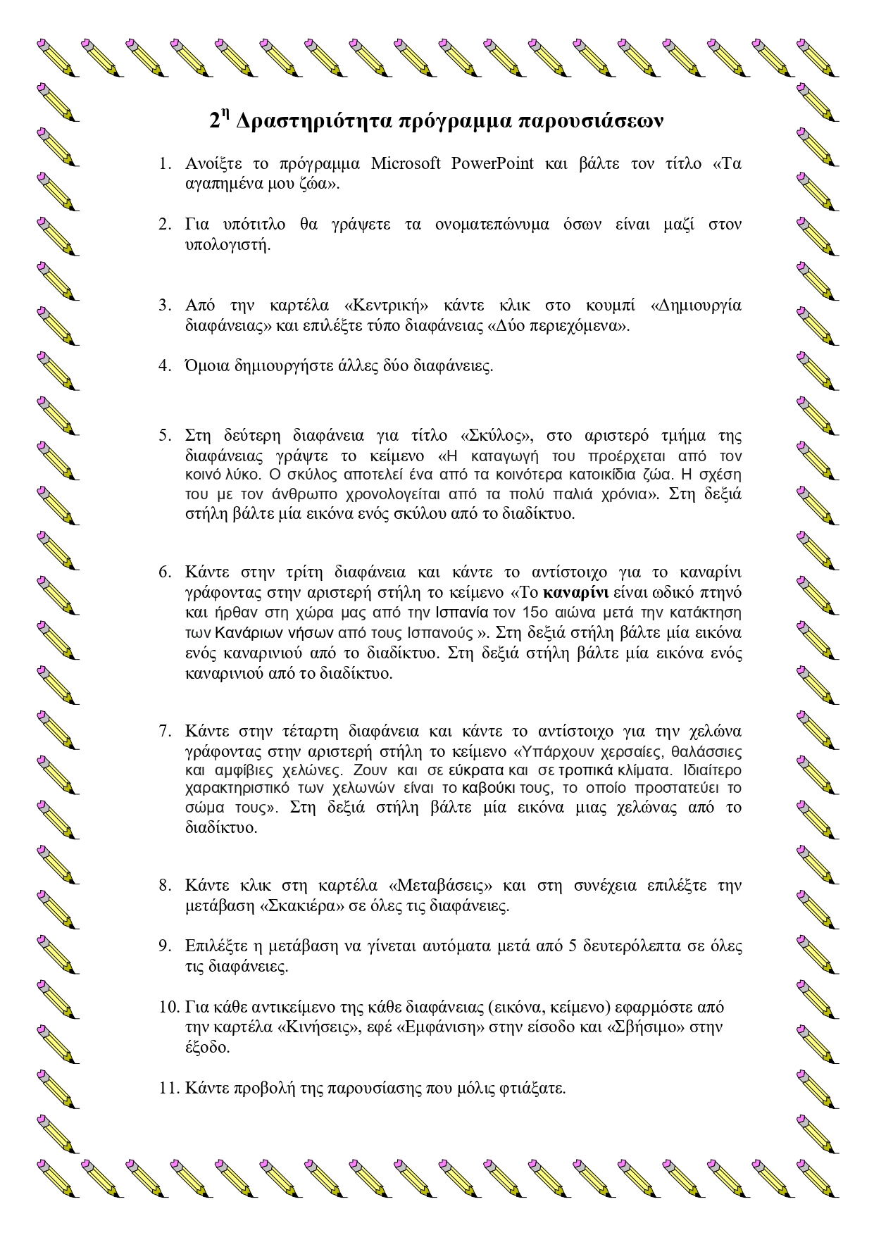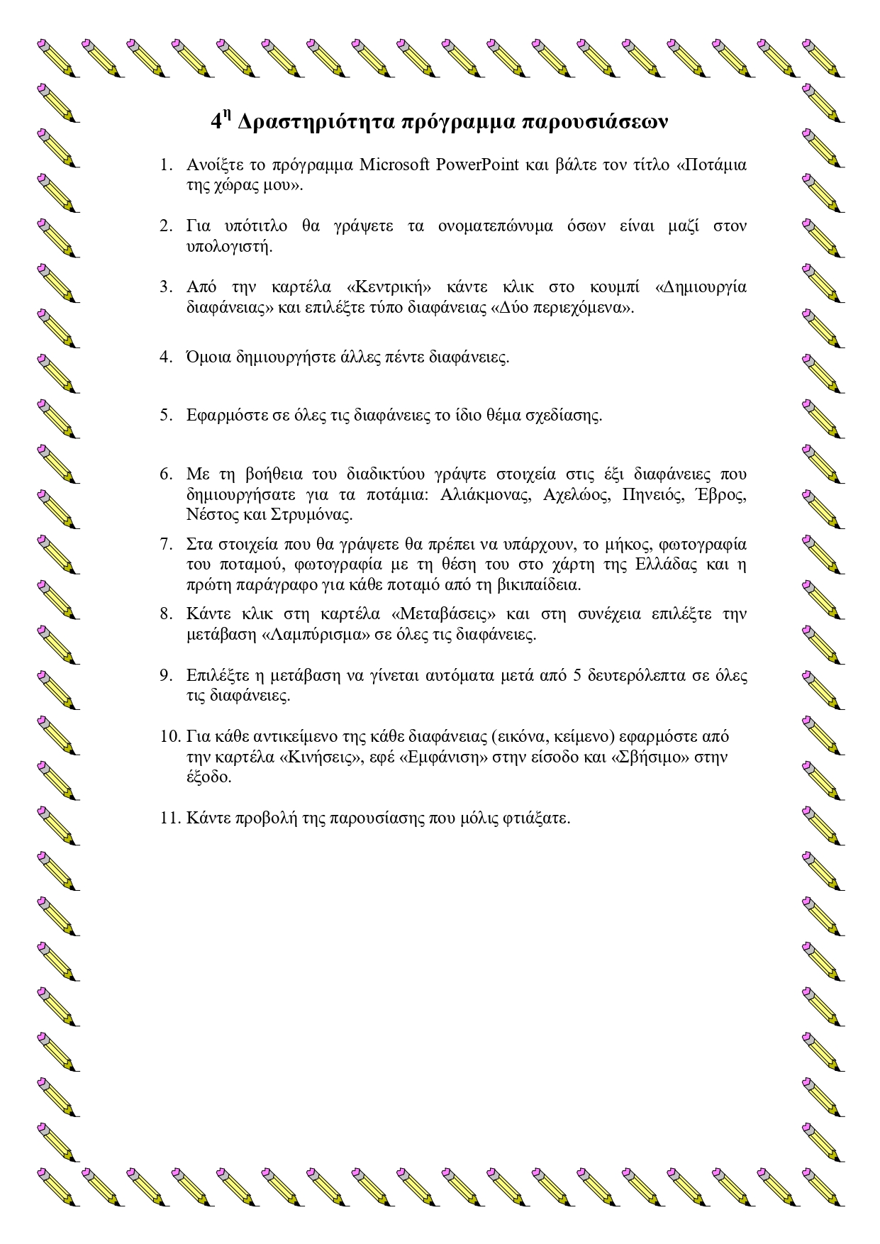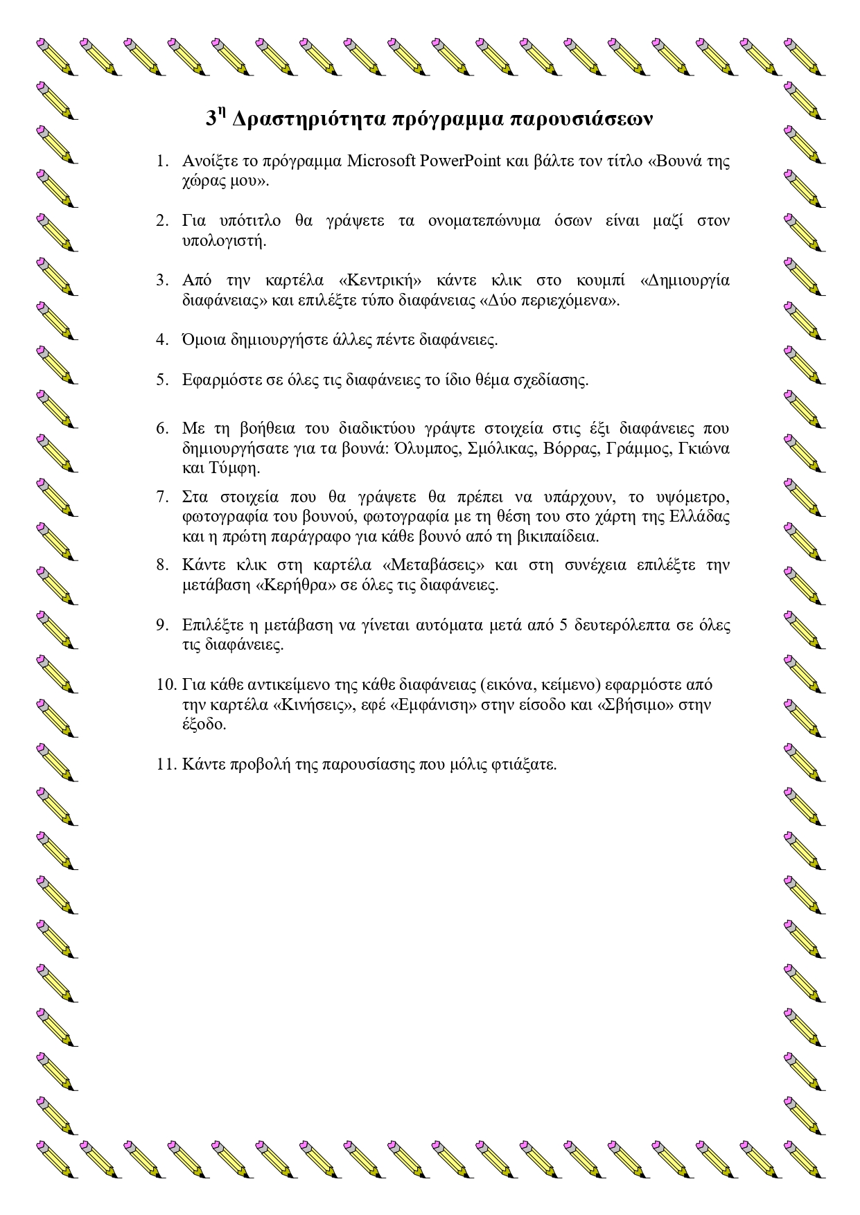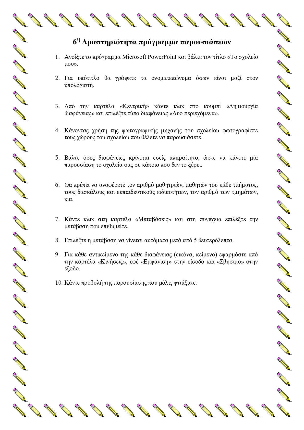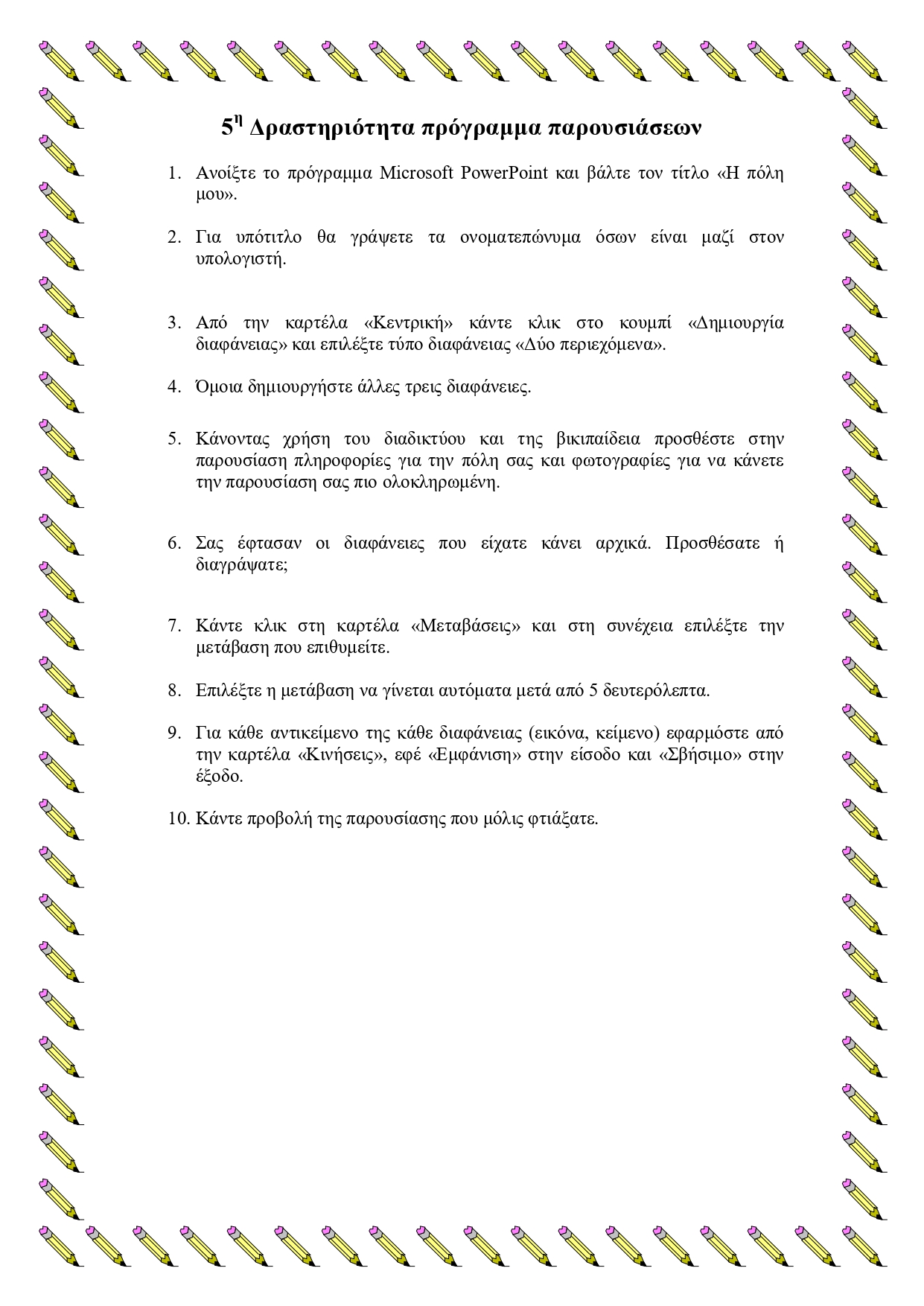 Ασκήσεις στο πρόγραμμα παρουσιάσεων PowerPoint Super User Ασκήσεις στο πρόγραμμα PowerPoint 05 Απριλίου 2020 Εμφανίσεις: 183 Πατήστε στις εικόνες για να ανοίξετε τα φύλλα δραστηριοτήτων για τις παρουσιάσεις Εκτύπωση Προηγούμενο